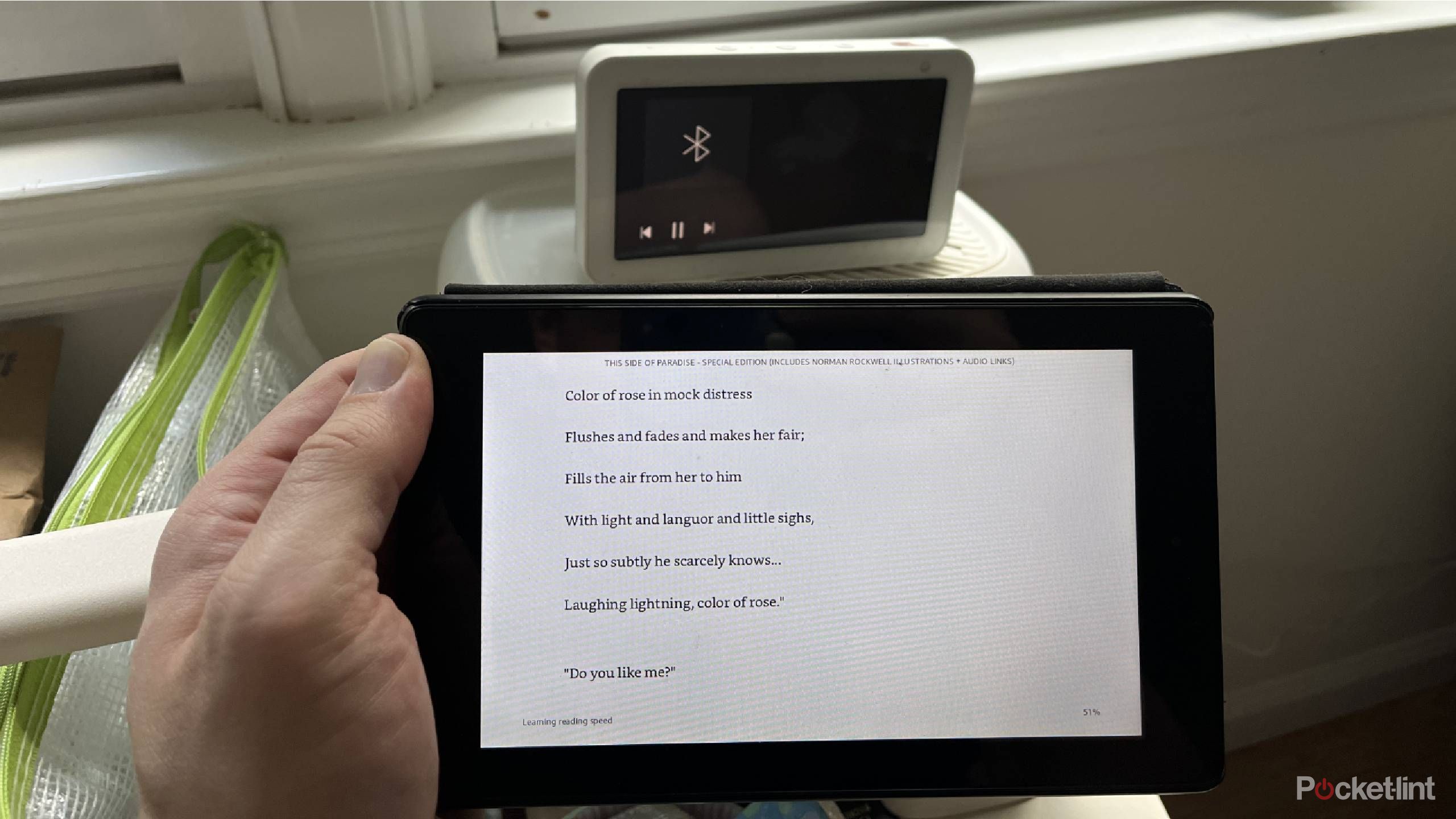 On that screen, there's a Play button on the right side. That’s what triggers Assistive Reading. As soon as I pressed it, the book snapped back into full-screen mode and a female computer voice began reading the novel aloud through my Echo Show. I then went about dusting my bedroom while listening to stories about Amory Blaine's time at Princeton.